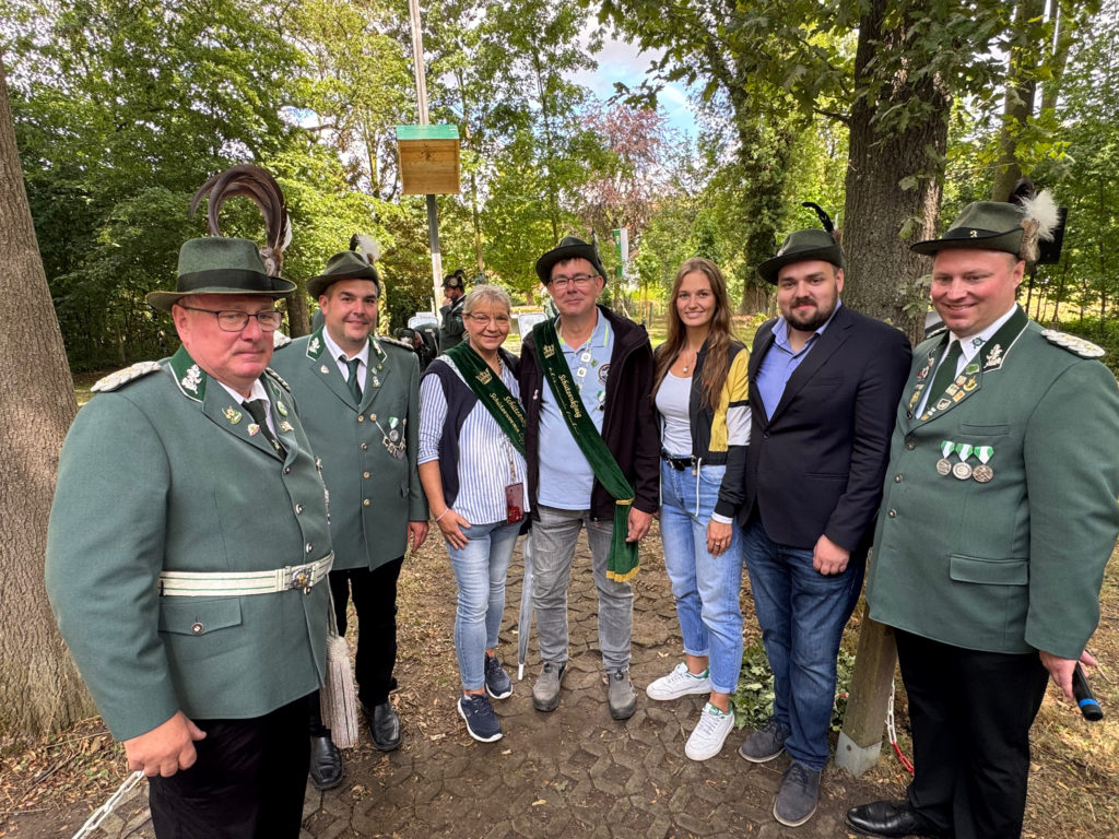 Königspaar 2025 Heike und Norbert Witte (3.v.l. und 4.v.l.), Königspaar 2024 Markus Nowotny und Michelle Hohoff (2.v.r. und 3.v.r.) mit unserem Oberst Berthold Hahues (links) sowie unserem 1. Vorsitzenden Julian Ahrens (rechts) und unserem 2. Vorsitzenden Phillipp Röttger (2.v.l.) - Vogelschießen 2025
